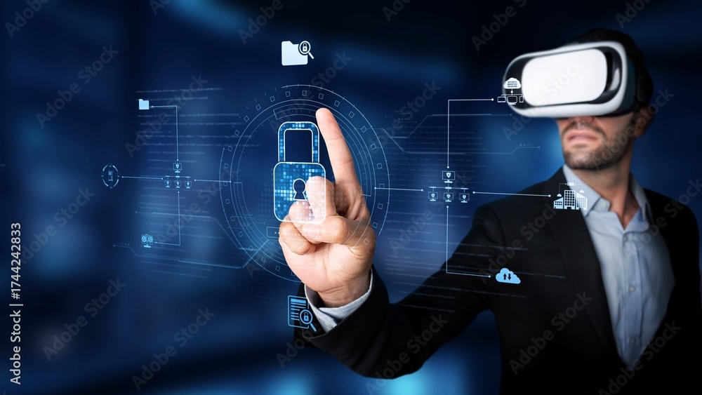 WEBLUX obraz na plátně 1D, 3D, 4D, 5D - A businessman experiencing virtual reality while interacting with a futuristic interface highlighting security concepts, emphasizing digital innovation and data protection. Raster