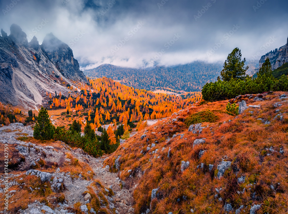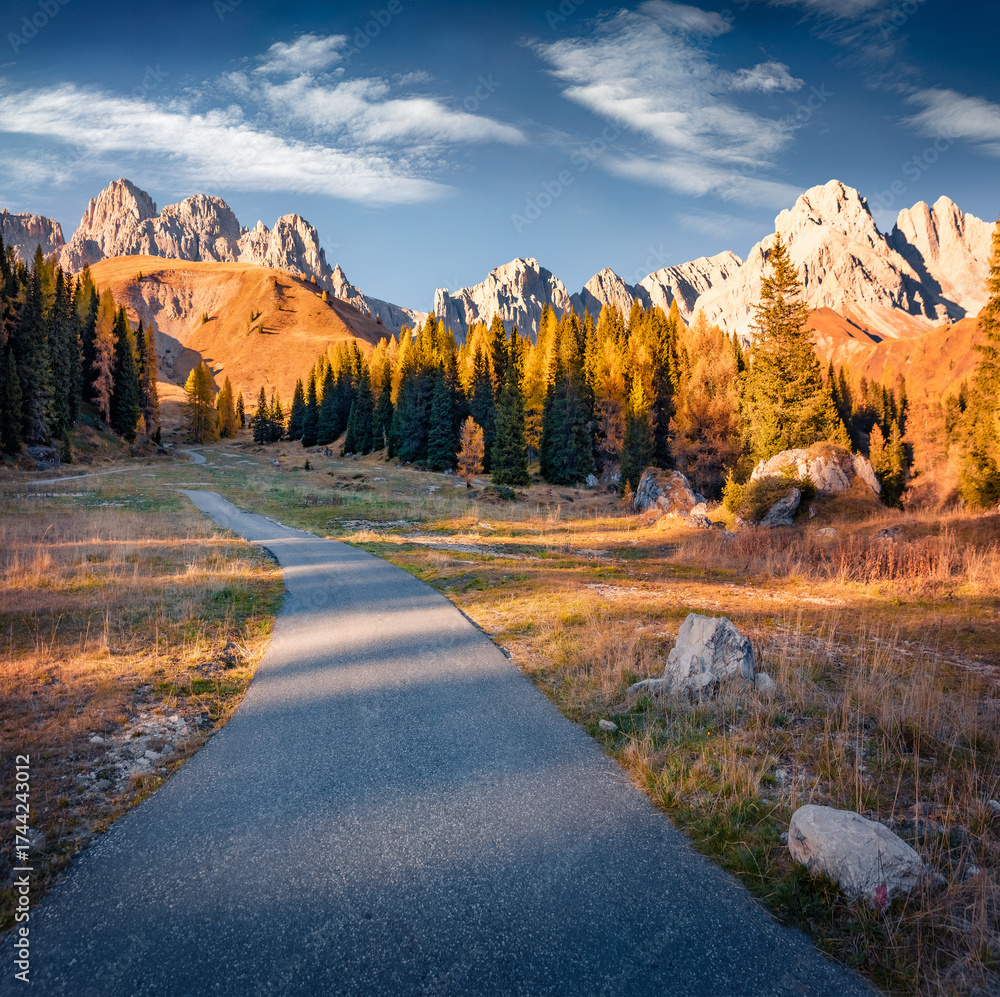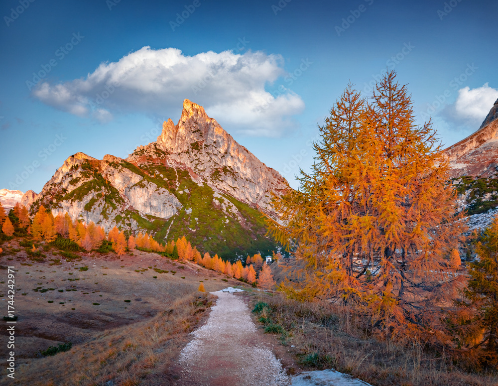 WEBLUX obraz na plátně 1D, 3D, 4D, 5D - Empty trek to Falzarego pass with Sass de Stria peak on background. Amazing autumn scene Dolomite Alps, Cortina d`Ampezzo lacattion, Italy, Europe. Beauty of nature concept background.