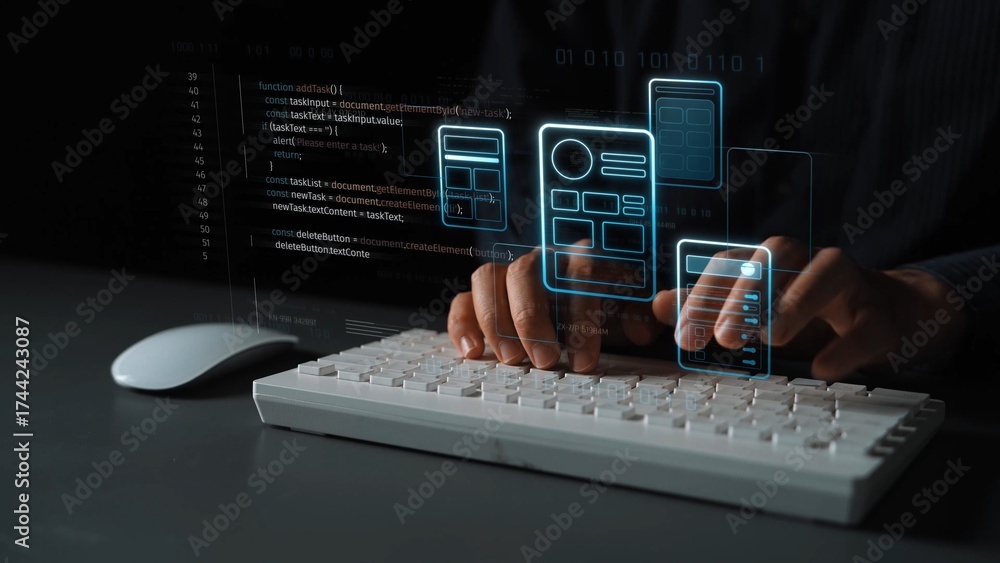 WEBLUX obraz na plátně 1D, 3D, 4D, 5D - UI UX mockup showing application layout, structure, and code interface. UI design defines user flow, UI design improves clarity, UI design enhances experience, and UX design supports logic. Marrow
