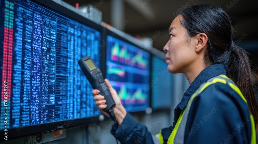WEBLUX obraz na plátně 1D, 3D, 4D, 5D - Medium shot of a warehouse worker using a handheld scanner to update an automated inventory system with digital screens displaying realtime stock data