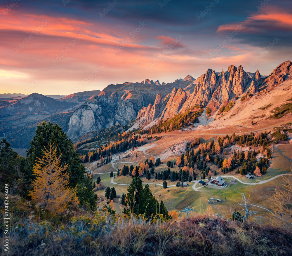 WEBLUX obraz na plátně 1D, 3D, 4D, 5D - Astonishing evening view of Gardena Pass. Majestic auatumn sunset in Dolomite Alps. Spectacular outdoor scene of Italy, Europe. Traveling concept background.