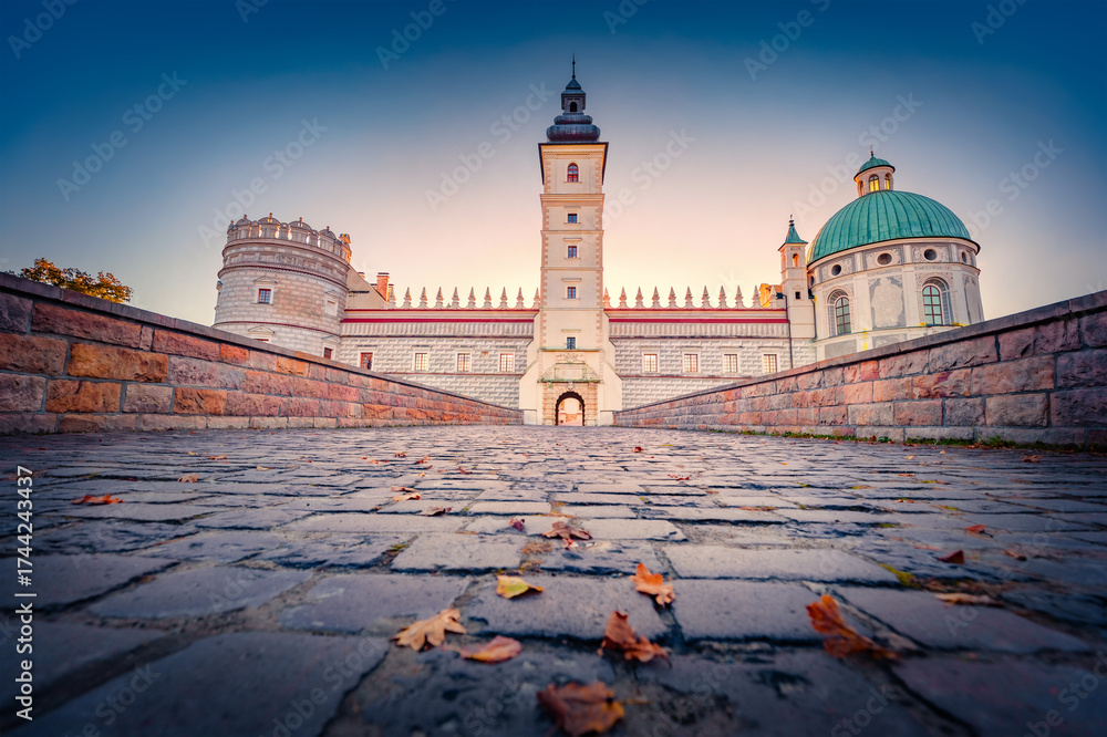 WEBLUX obraz na plátně 1D, 3D, 4D, 5D - Majestic morning view of Krasiczyn Castle. Picturesque autumn cityscape of Krasiczyn, village in Przemysl County, Subcarpathian Voivodeship, in south-eastern Poland, Europe.