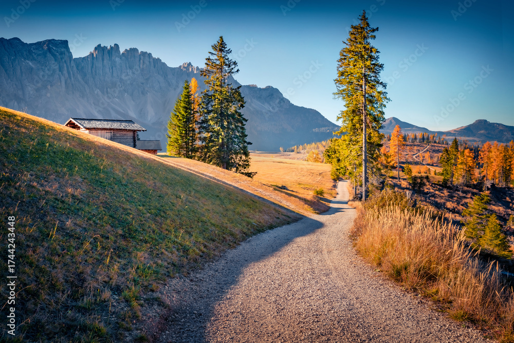 WEBLUX obraz na plátně 1D, 3D, 4D, 5D - Colorful autumn view of hottel on Pradidali valley, Province of Trento, Italy, Europe. Wonderful morning scene of Dolomite Alps with old country road. Beauty of countryside concept background.