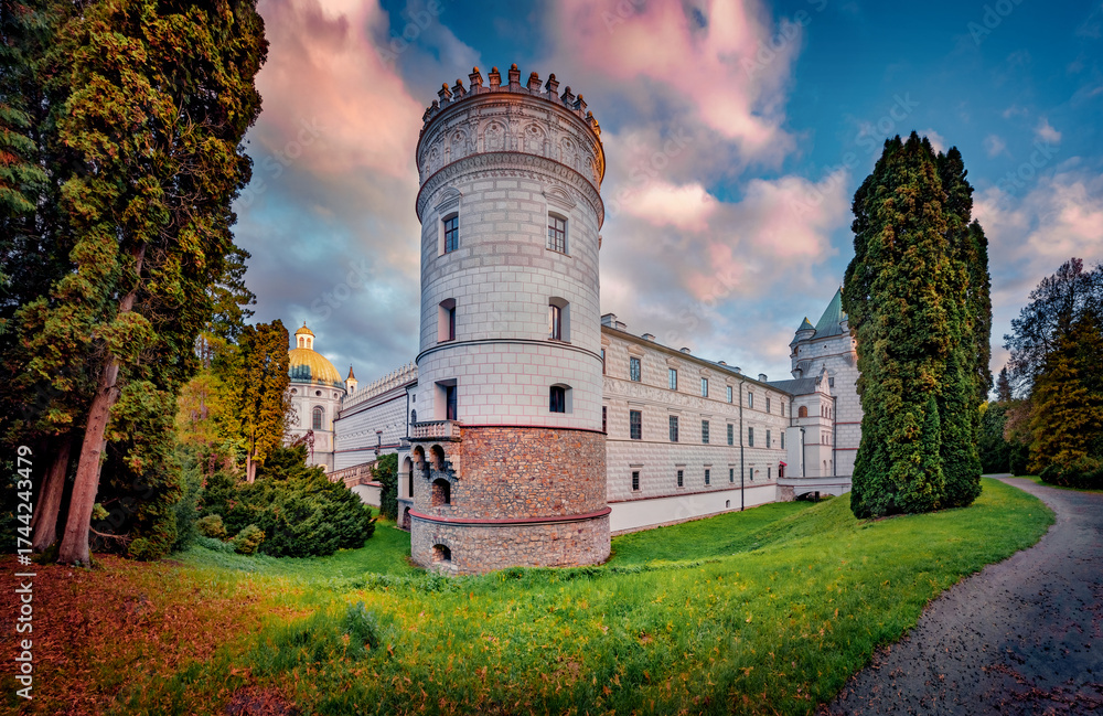 WEBLUX obraz na plátně 1D, 3D, 4D, 5D - Majestic morning view of Krasiczyn Castle. Spectacular summer sunrise in Krasiczyn, village in Przemysl County, Subcarpathian Voivodeship, in south-eastern Poland, Europe.