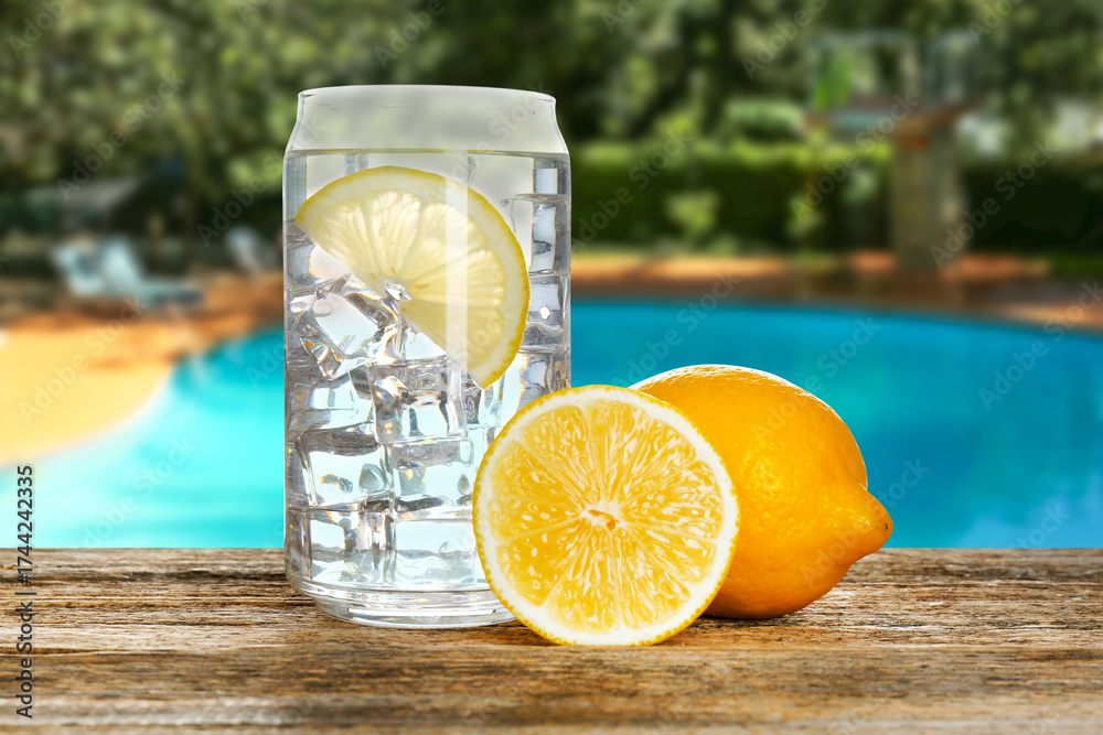 WEBLUX obraz na plátně 1D, 3D, 4D, 5D - Refreshing water with lemon and ice on table near outdoor swimming pool