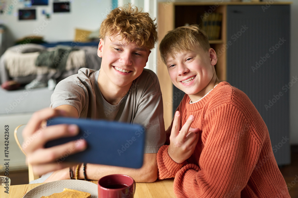 WEBLUX obraz na plátně 1D, 3D, 4D, 5D - Portrait of two Caucasian teenage boys smiling and posing for selfie at table, one holding smartphone while other making peace sign gesture, casual indoor setting visible in background