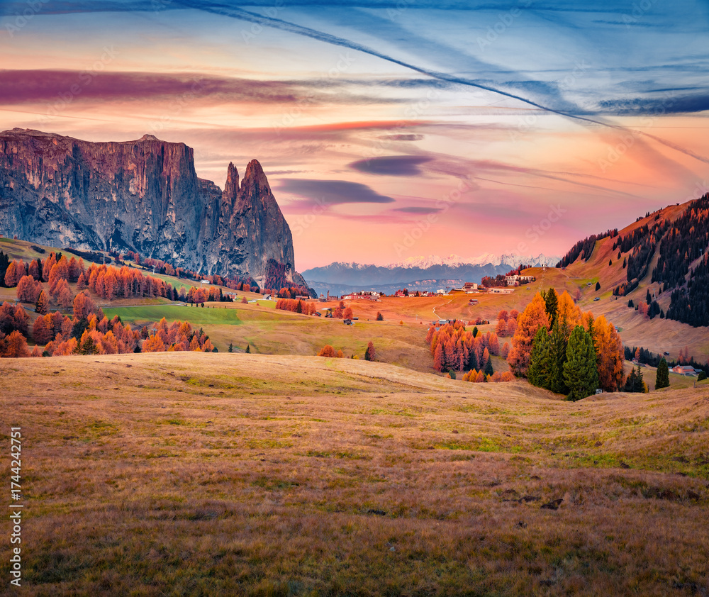 WEBLUX obraz na plátně 1D, 3D, 4D, 5D - Astonishing autumn view of Alpe di Siusi mountain plateau. Impressive morning scene of Dolomite Alps, Ortisei locattion, Italy. Beauty of nature concept background.