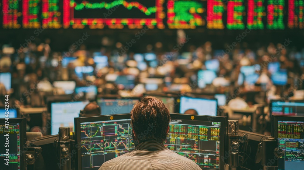 WEBLUX obraz na plátně 1D, 3D, 4D, 5D - Trader focused on monitors displaying fluctuating bean futures market data inside a busy exchange floor with fellow traders and screens out of focus.