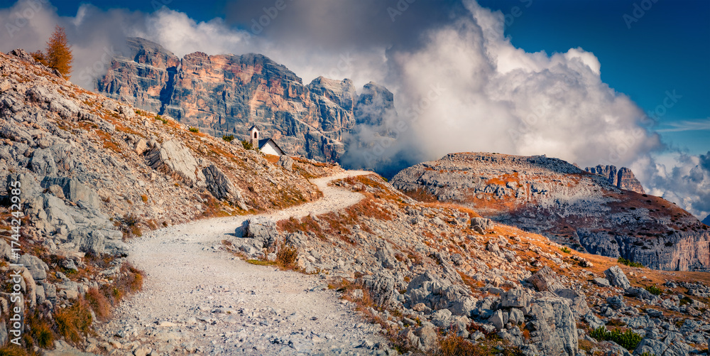 WEBLUX obraz na plátně 1D, 3D, 4D, 5D - Panoramic autumn view of Dolomite mountains with small chapel Cappella degli Alpini on background. Amazing morning scvene of Tre Cime Di Lavaredo National Park, Italy. Traveling concept background.