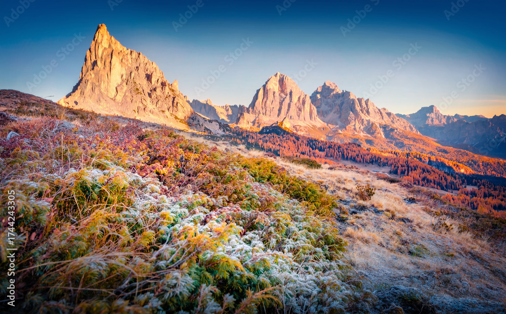 WEBLUX obraz na plátně 1D, 3D, 4D, 5D - Frozen grass at the foot of Ra Gusela mountain. Majestic sunrise in Dolomite Alps. Wonderful morning scene of Giau pass, Italy, Europe. Beauty of nature concept background.
