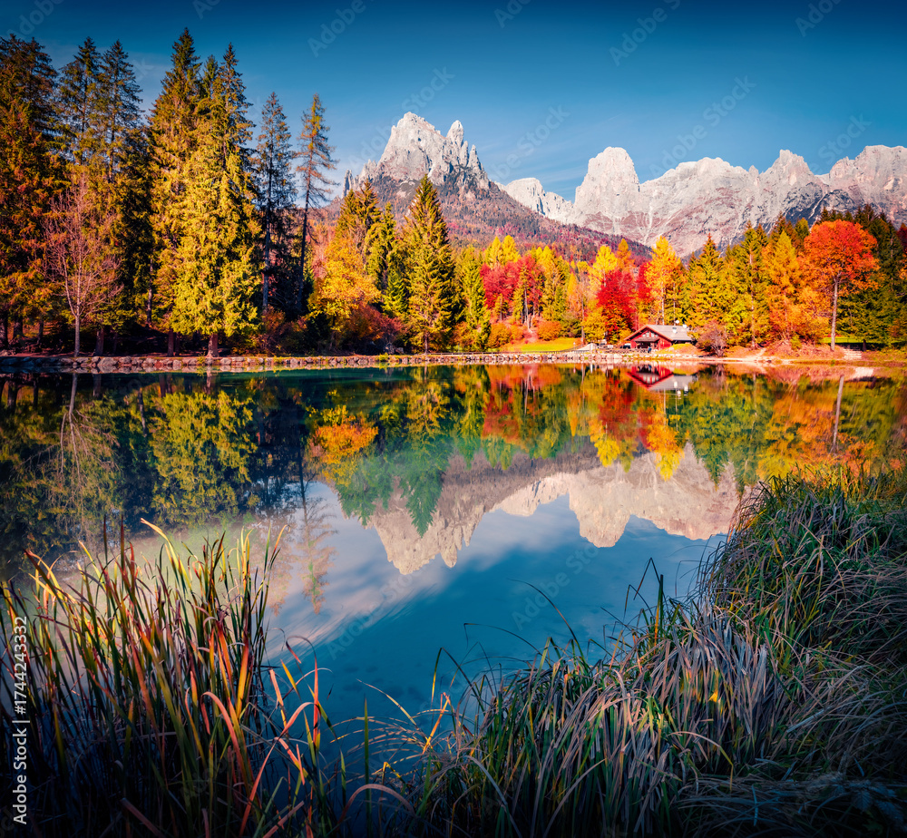 WEBLUX obraz na plátně 1D, 3D, 4D, 5D - Attractive autumn scene of Welsperg lake in the middle of the autumn forest. Incredible morning view of Tonadico, Province of Trento, Italy, Europe. Exotic landscape of Dolomite Alps.