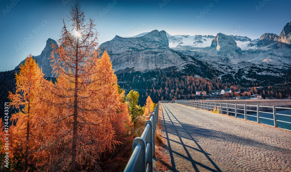 WEBLUX obraz na plátně 1D, 3D, 4D, 5D - Huge mountain range on background on walkway on dam on Fedaia lake. Incredible autumn view of Dolomite Alps. Gorgeous morning scene of Italy, Europe. Traveling concept background.