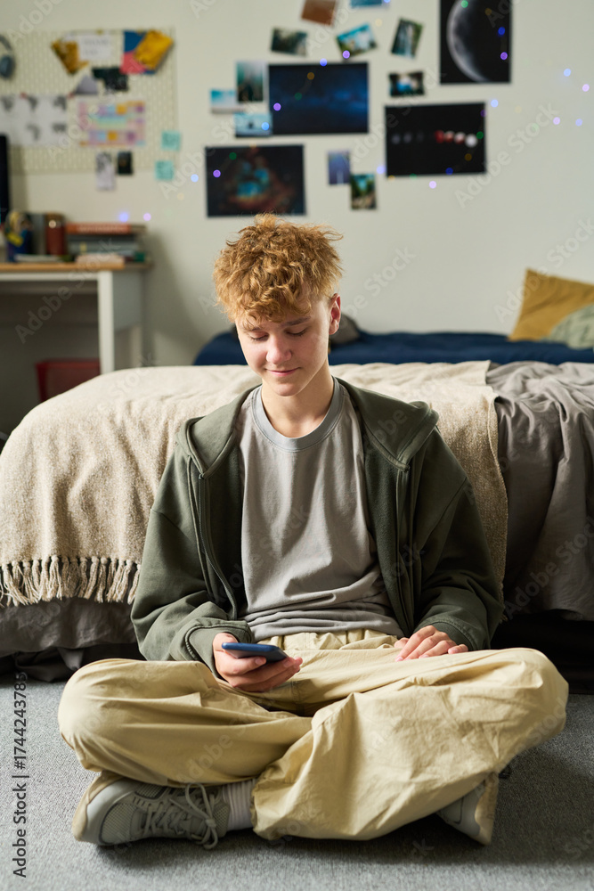 WEBLUX obraz na plátně 1D, 3D, 4D, 5D - Caucasian teenage boy sitting cross legged on floor in bedroom using smartphone, looking down at device with relaxed expression, casual posture, wall decorated with photos behind