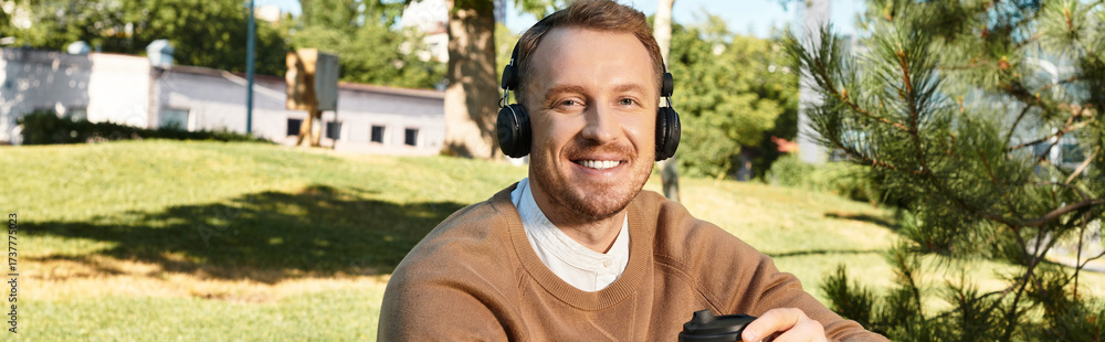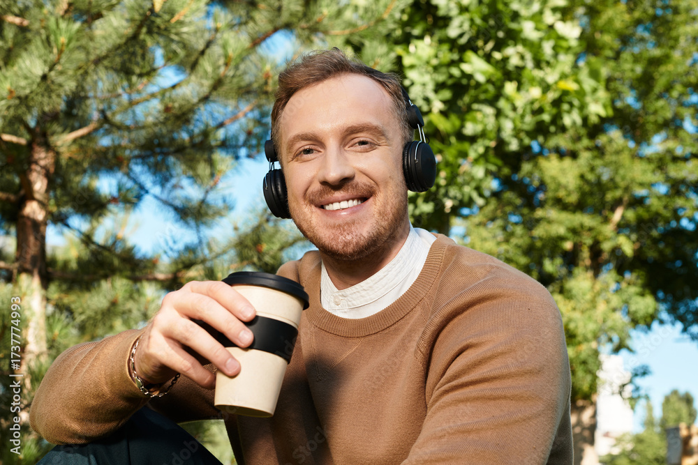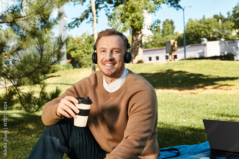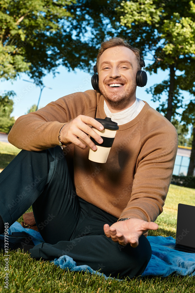 WEBLUX obraz na plátně 1D, 3D, 4D, 5D - Young university teacher enjoys a break with coffee and music in a sunny outdoor setting
