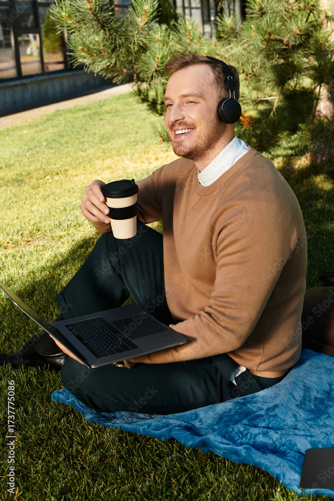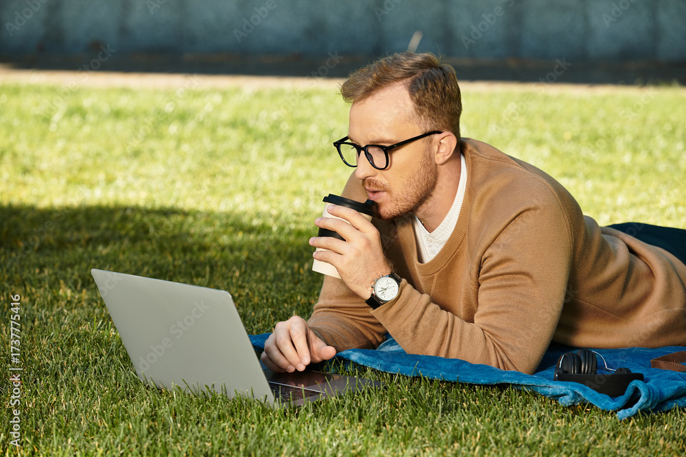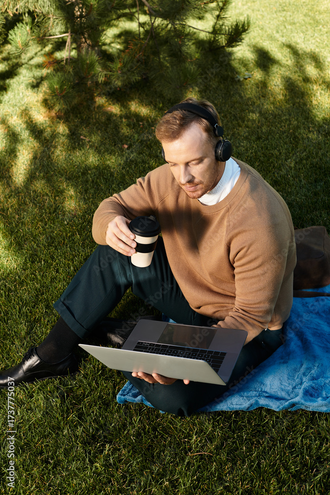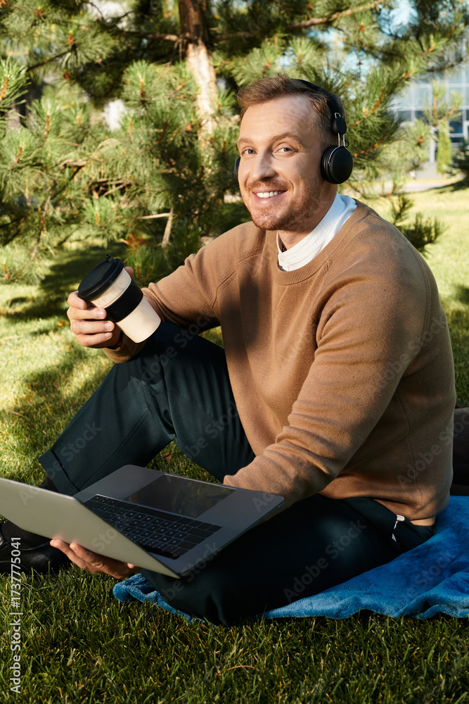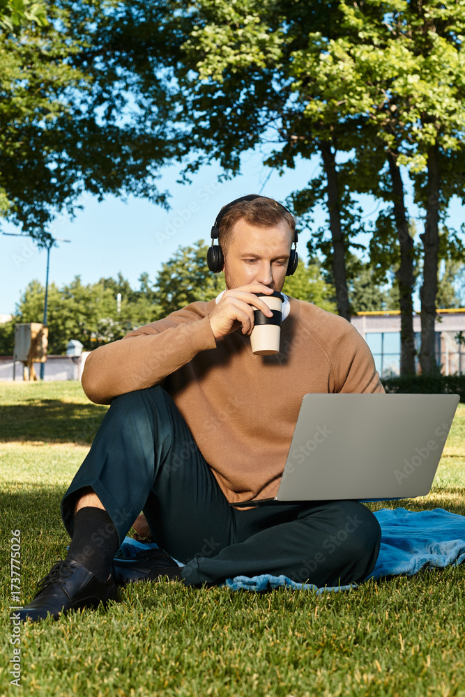 WEBLUX obraz na plátně 1D, 3D, 4D, 5D - Young university teacher enjoying nature while working on his laptop and sipping coffee