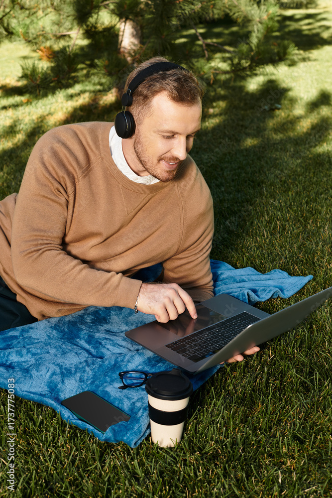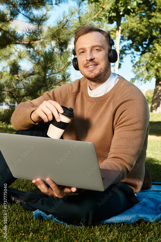 WEBLUX obraz na plátně 1D, 3D, 4D, 5D - Young university teacher enjoys a coffee break while working outdoors on a laptop in the park