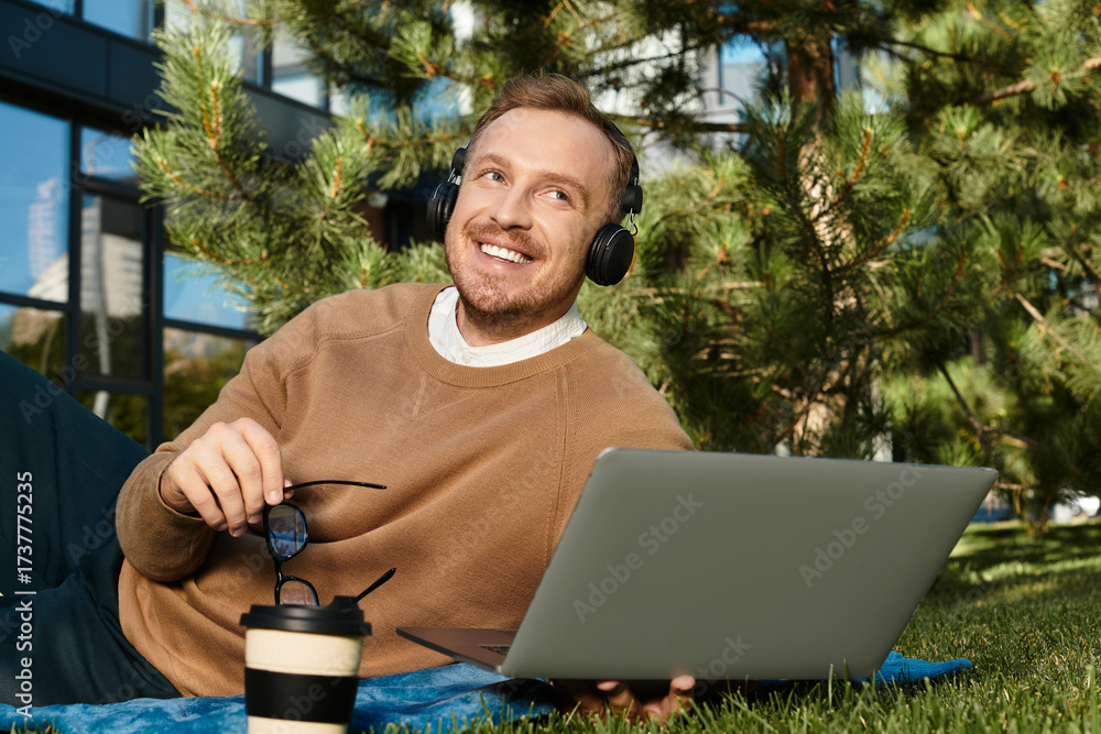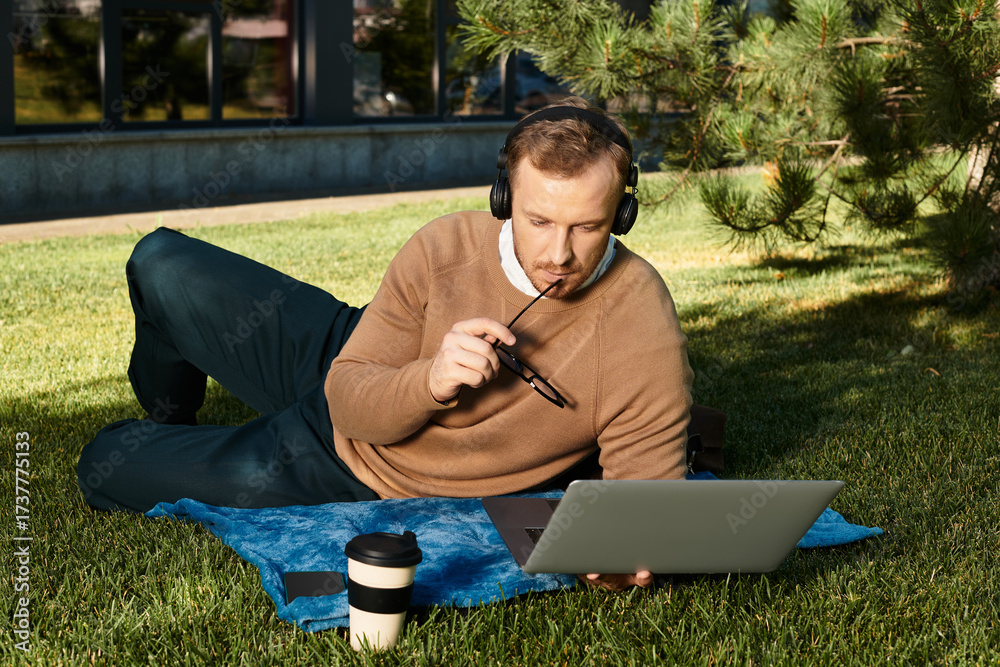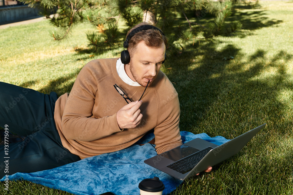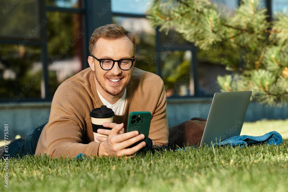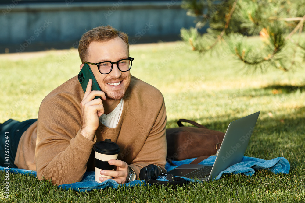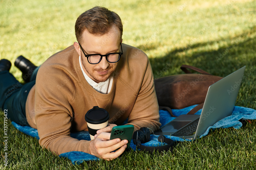 WEBLUX obraz na plátně 1D, 3D, 4D, 5D - Young university teacher enjoys a sunny day outdoors while working on his laptop and phone