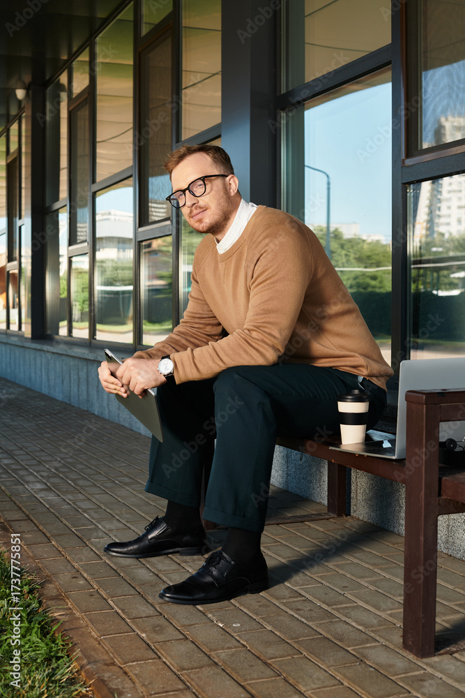 WEBLUX obraz na plátně 1D, 3D, 4D, 5D - Young university teacher enjoys time outdoors while working on laptop with coffee in hand