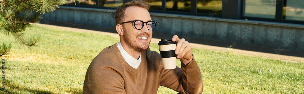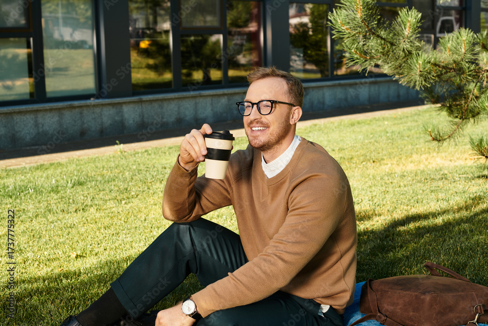 WEBLUX obraz na plátně 1D, 3D, 4D, 5D - Cheerful young university teacher enjoying coffee outdoors on a sunny day