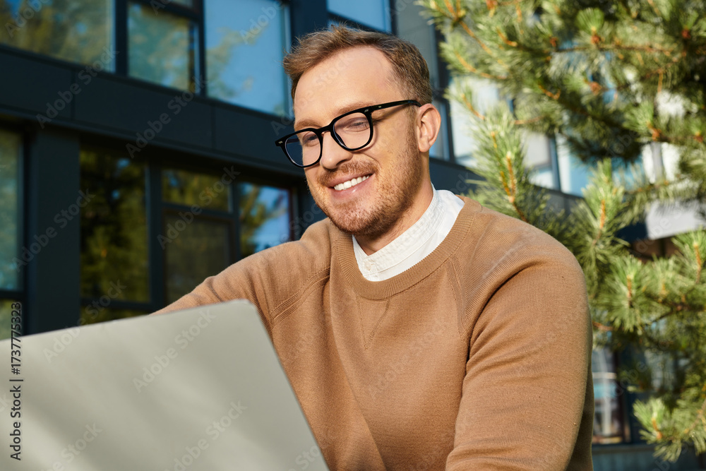 WEBLUX obraz na plátně 1D, 3D, 4D, 5D - Young university teacher enjoys a peaceful moment outdoors while working on a laptop