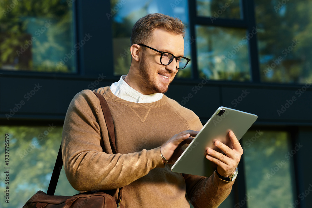 WEBLUX obraz na plátně 1D, 3D, 4D, 5D - Young university teacher enjoys technology while standing outdoors at the campus