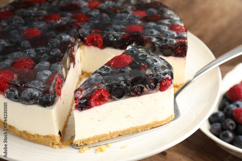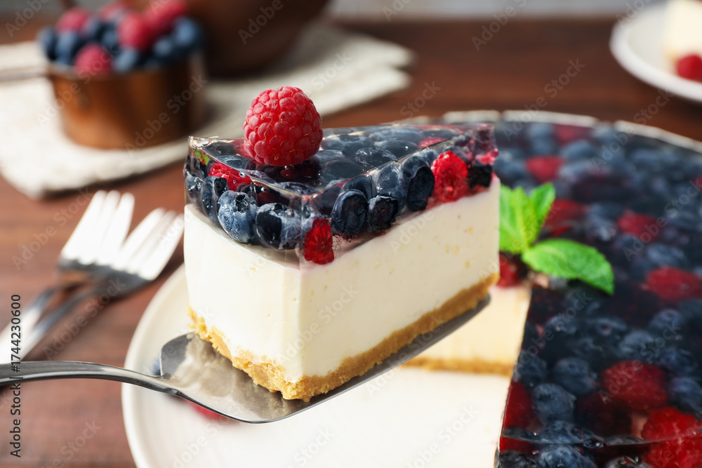 WEBLUX obraz na plátně 1D, 3D, 4D, 5D - Cake server with piece of delicious berry cheesecake, closeup