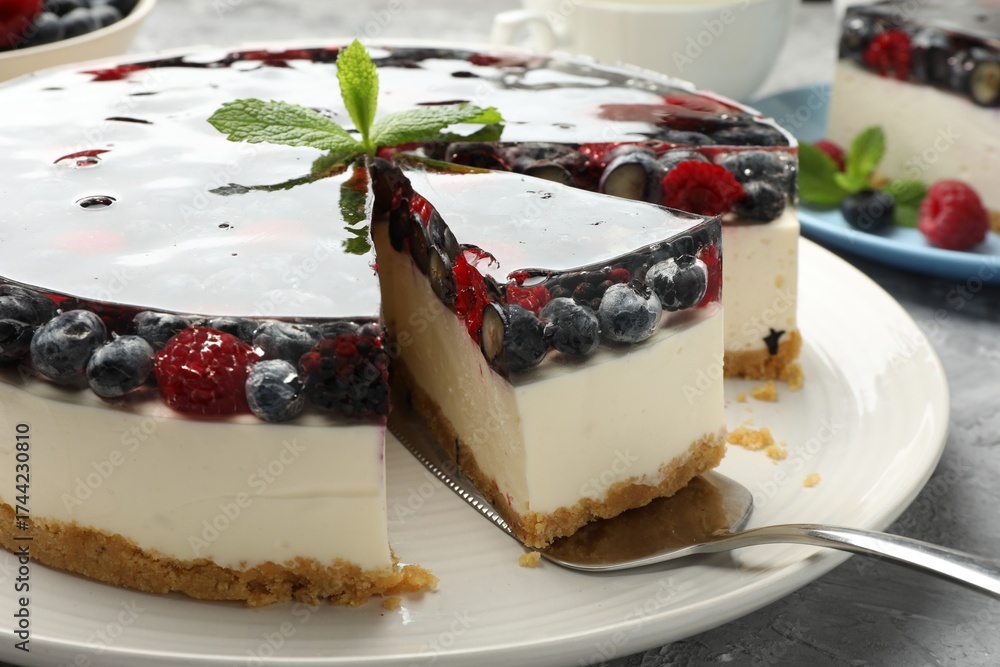 WEBLUX obraz na plátně 1D, 3D, 4D, 5D - Taking piece of delicious cheesecake with berries at grey table, closeup