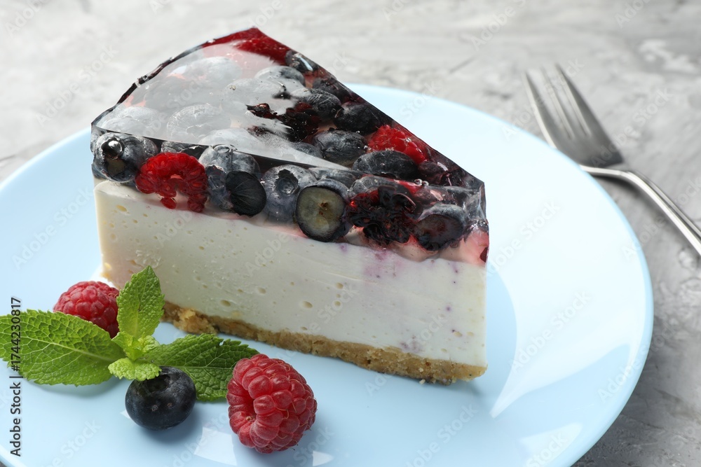 WEBLUX obraz na plátně 1D, 3D, 4D, 5D - Piece of delicious cheesecake with berries, mint and fork on grey table, closeup