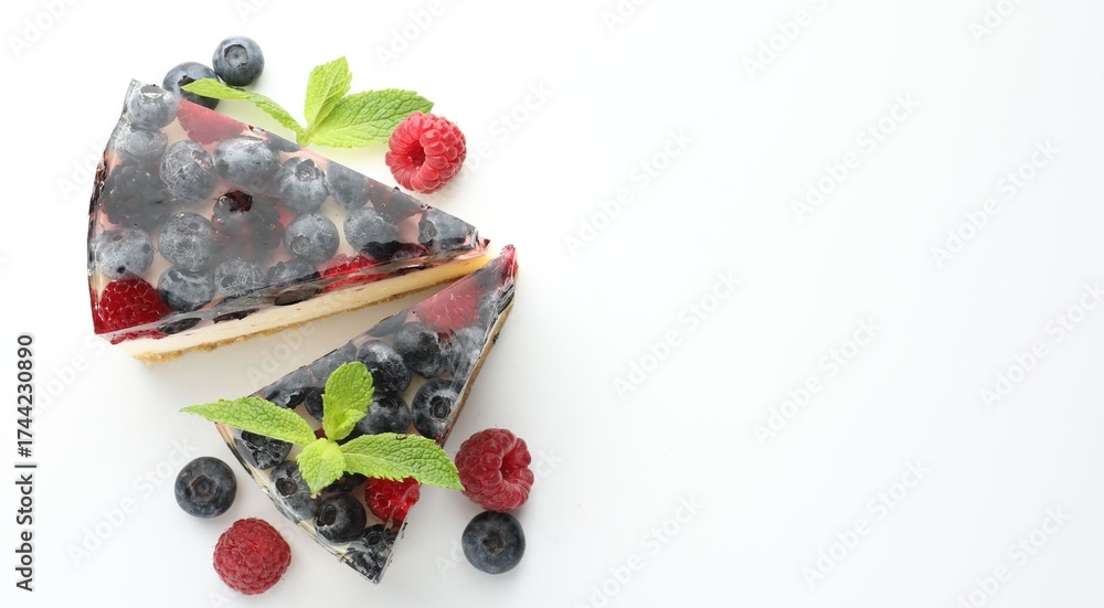 WEBLUX obraz na plátně 1D, 3D, 4D, 5D - Pieces of delicious cheesecake with berries and mint on white table, flat lay. Space for text