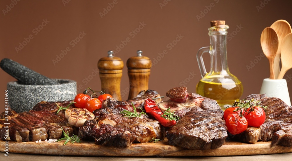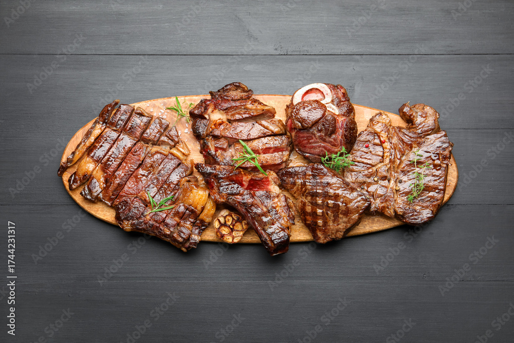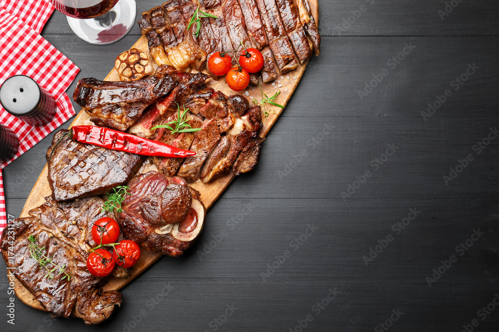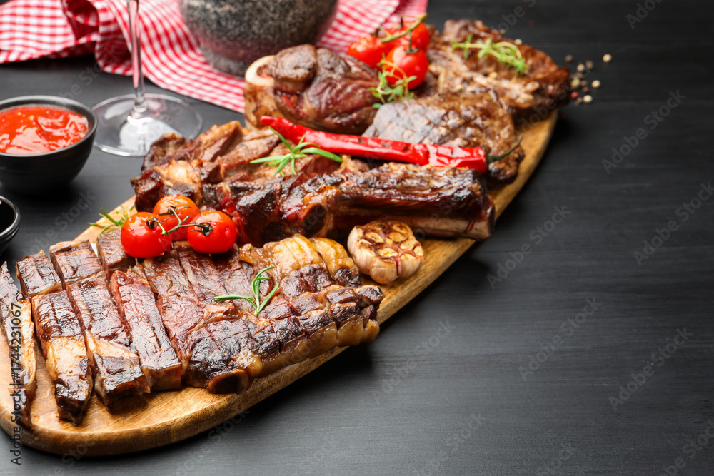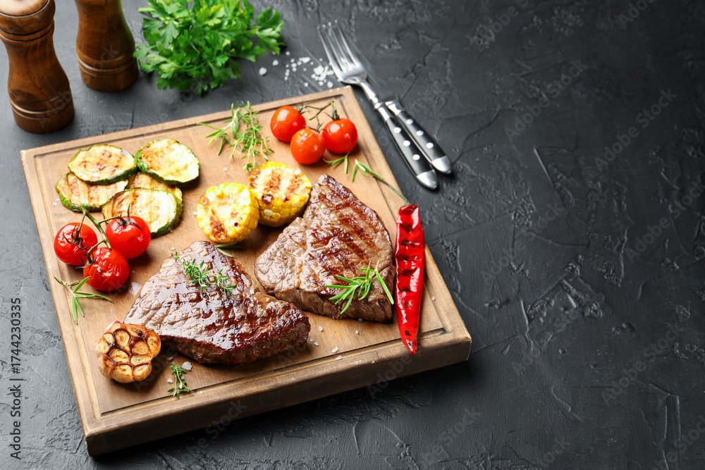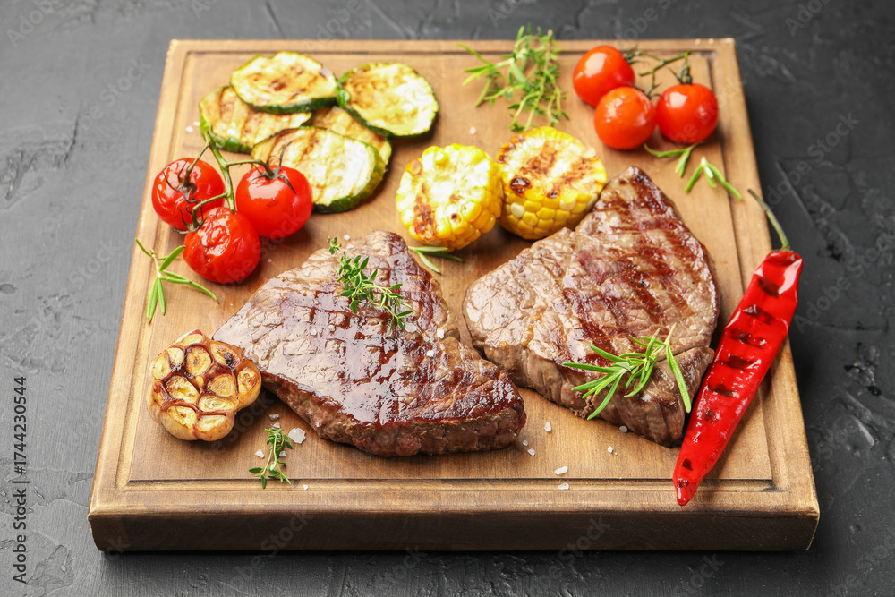 WEBLUX obraz na plátně 1D, 3D, 4D, 5D - Delicious grilled beef steaks with herbs and vegetables on dark textured table. Space for text