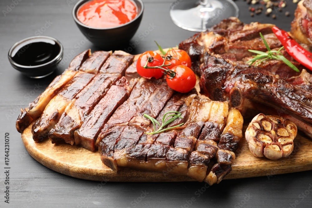 WEBLUX obraz na plátně 1D, 3D, 4D, 5D - Tasty grilled beef steak served with rosemary, sauce and tomatoes on black wooden table, closeup