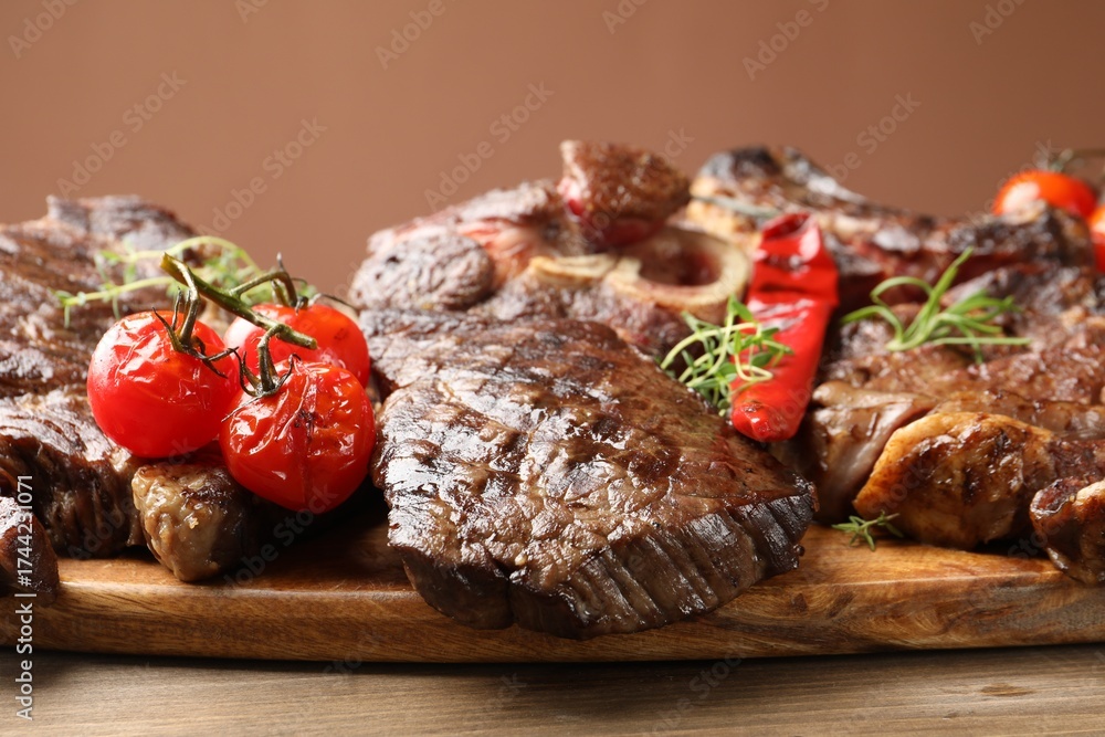WEBLUX obraz na plátně 1D, 3D, 4D, 5D - Pieces of tasty grilled beef with rosemary and vegetables on wooden table, closeup