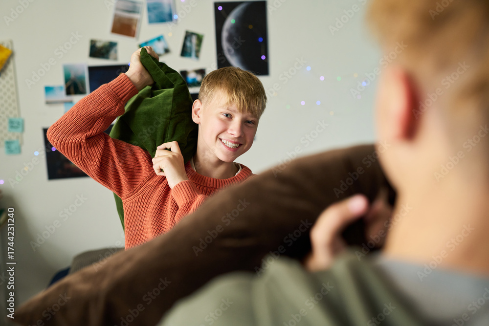 WEBLUX obraz na plátně 1D, 3D, 4D, 5D - Caucasian teenage boys having playful pillow fight in bedroom, one smiling while raising pillow, photos and decorations visible on wall in background, brothers enjoying time together