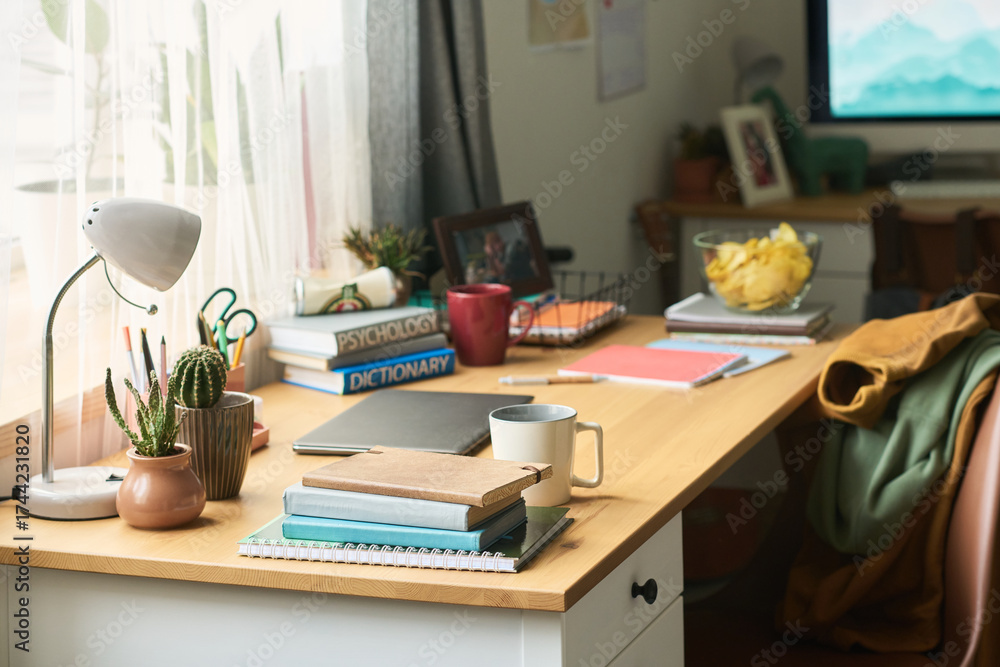 WEBLUX obraz na plátně 1D, 3D, 4D, 5D - Closeup of organized wooden desk with stack of notebooks, psychology and dictionary books, potted plants, cup of coffee, bowl of chips, digital tablet, sunlight streaming through window