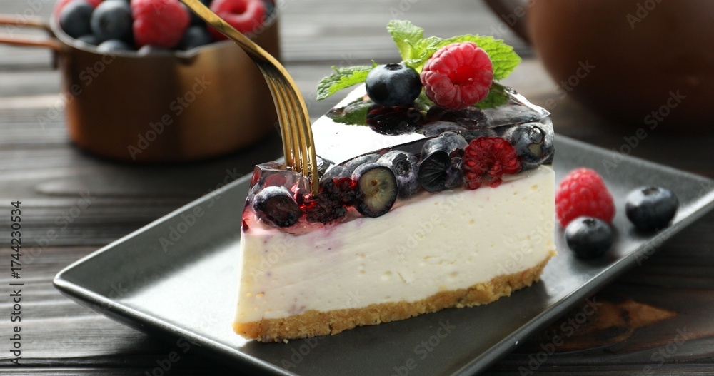 WEBLUX obraz na plátně 1D, 3D, 4D, 5D - Taking piece of delicious cheesecake with berries at table, closeup