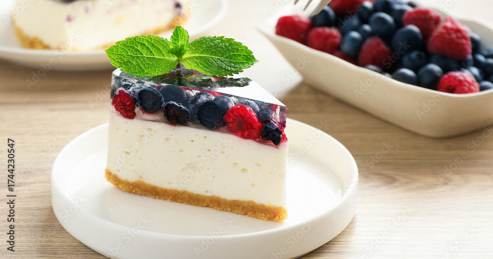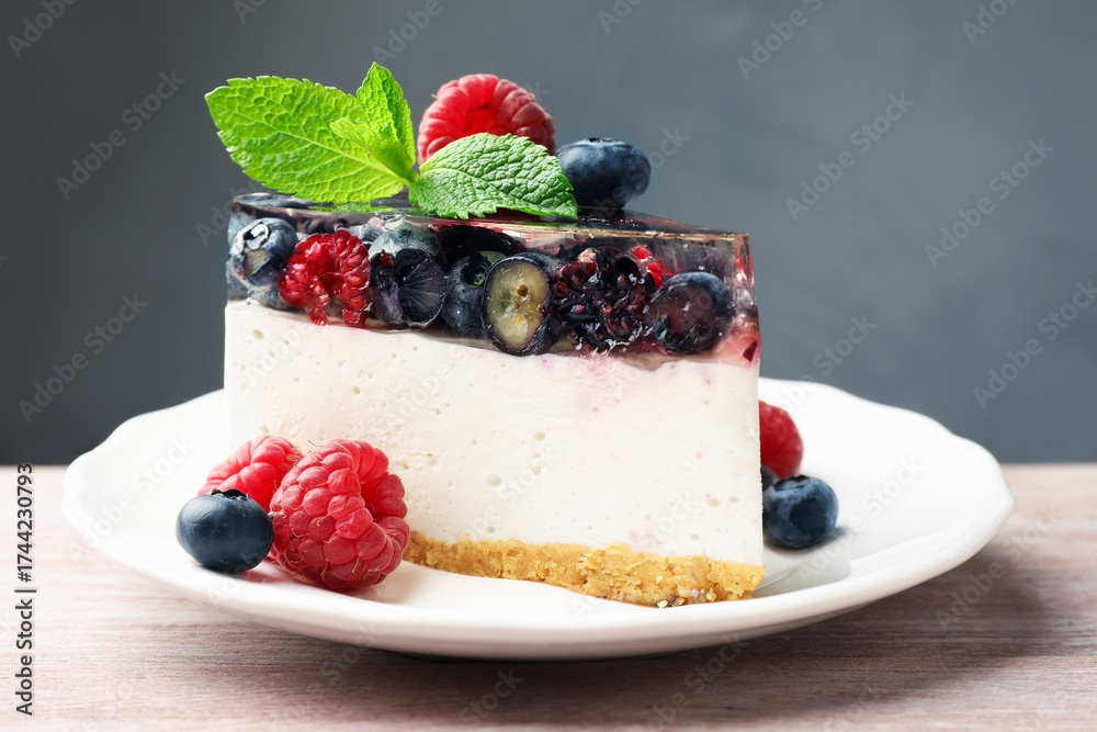 WEBLUX obraz na plátně 1D, 3D, 4D, 5D - Piece of delicious cheesecake with berries and mint on wooden table, closeup
