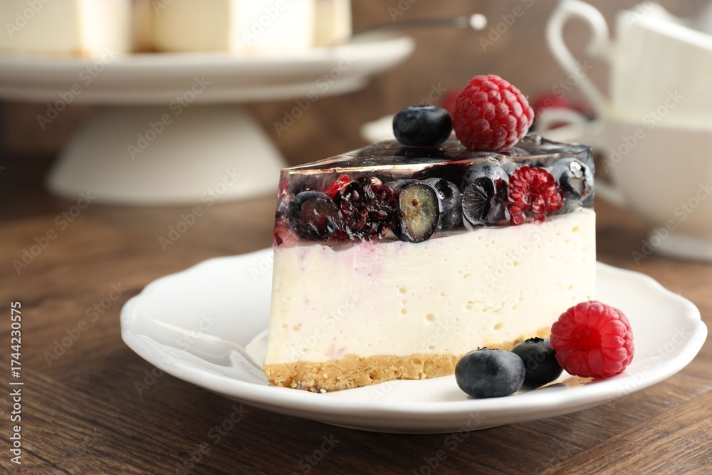 WEBLUX obraz na plátně 1D, 3D, 4D, 5D - Piece of delicious cheesecake with berries on wooden table, closeup