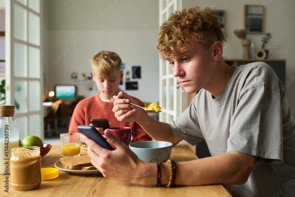 WEBLUX obraz na plátně 1D, 3D, 4D, 5D - Two Caucasian teenage boys sitting at table eating breakfast, one holding smartphone and spoon while looking at screen, other focused on mobile device with food in front