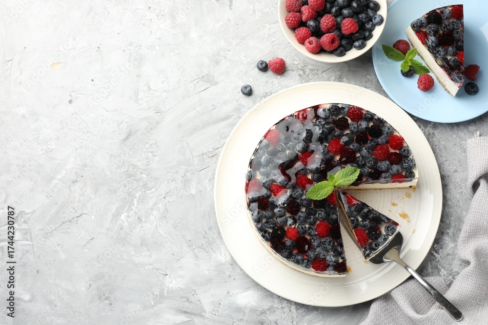 WEBLUX obraz na plátně 1D, 3D, 4D, 5D - Taking piece of delicious cheesecake with berries at grey textured table, flat lay. Space for text