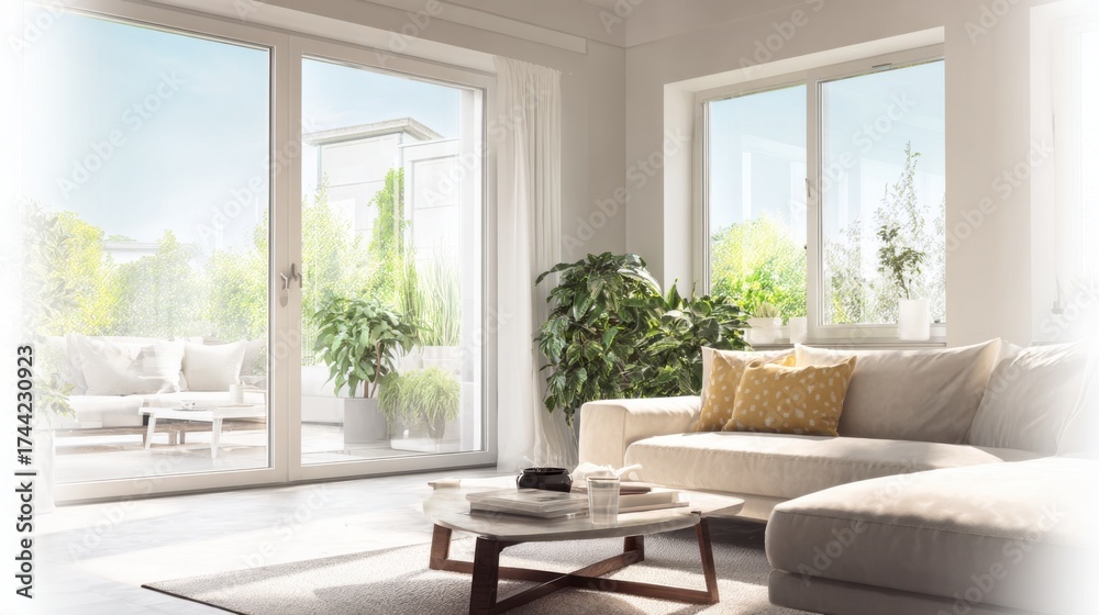 WEBLUX obraz na plátně 1D, 3D, 4D, 5D - Medium shot focusing on energysaving smart windows optimizing natural daylight in a bright living room while lowering cooling costs.