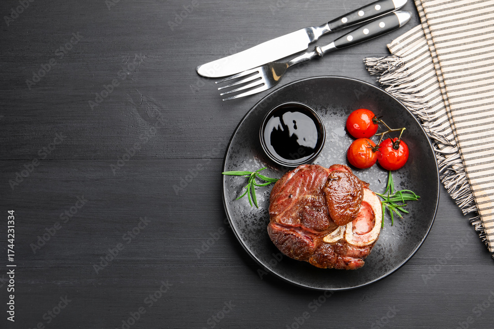 WEBLUX obraz na plátně 1D, 3D, 4D, 5D - Tasty grilled beef steak served with rosemary, sauce, tomatoes and cutlery on black wooden table, flat lay. Space for text