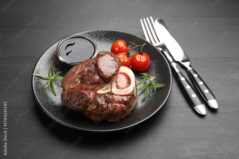 WEBLUX obraz na plátně 1D, 3D, 4D, 5D - Tasty grilled beef steak served with rosemary, sauce, tomatoes and cutlery on black wooden table