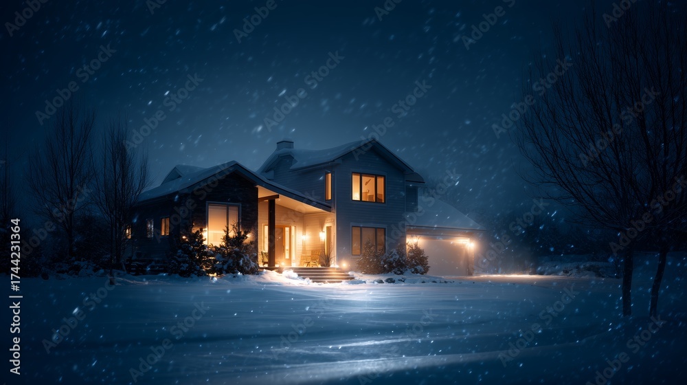 WEBLUX obraz na plátně 1D, 3D, 4D, 5D - Cozy house illuminated by warm lights during a snowy night in a quiet neighborhood
