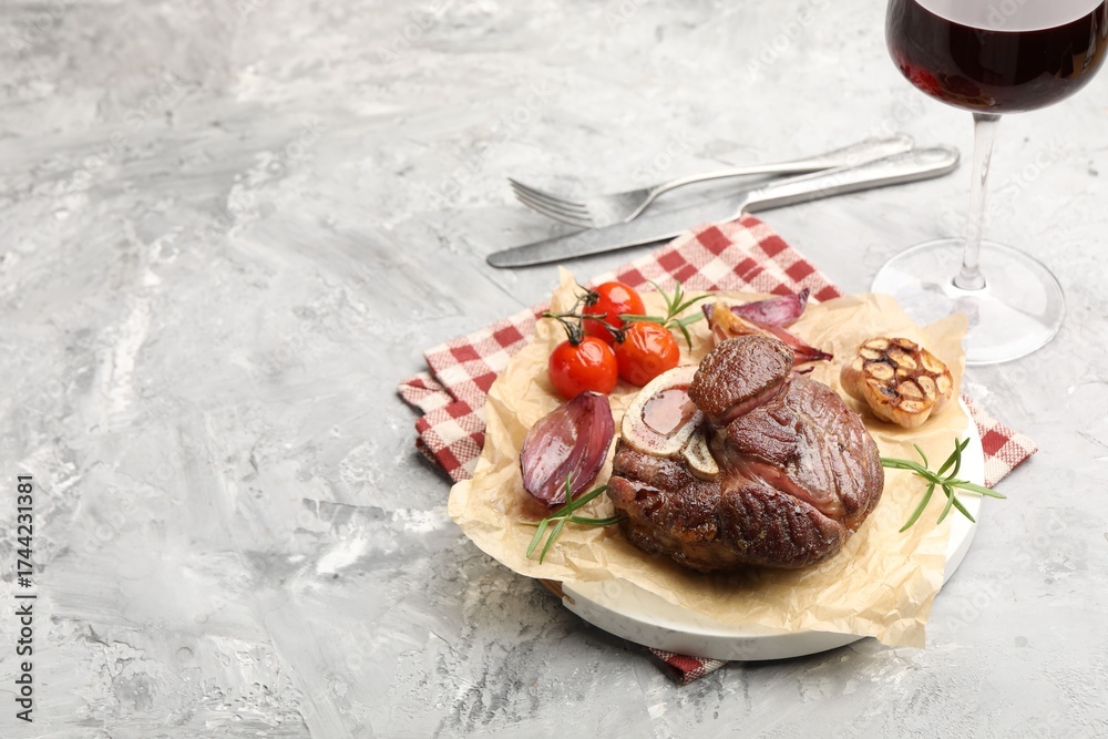 WEBLUX obraz na plátně 1D, 3D, 4D, 5D - Tasty cut beef steak served with rosemary, garlic, tomatoes and wine on grey textured table, space for text