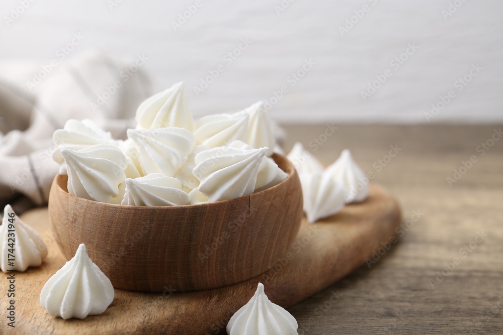 WEBLUX obraz na plátně 1D, 3D, 4D, 5D - Delicious meringue cookies on wooden table, closeup. Space for text