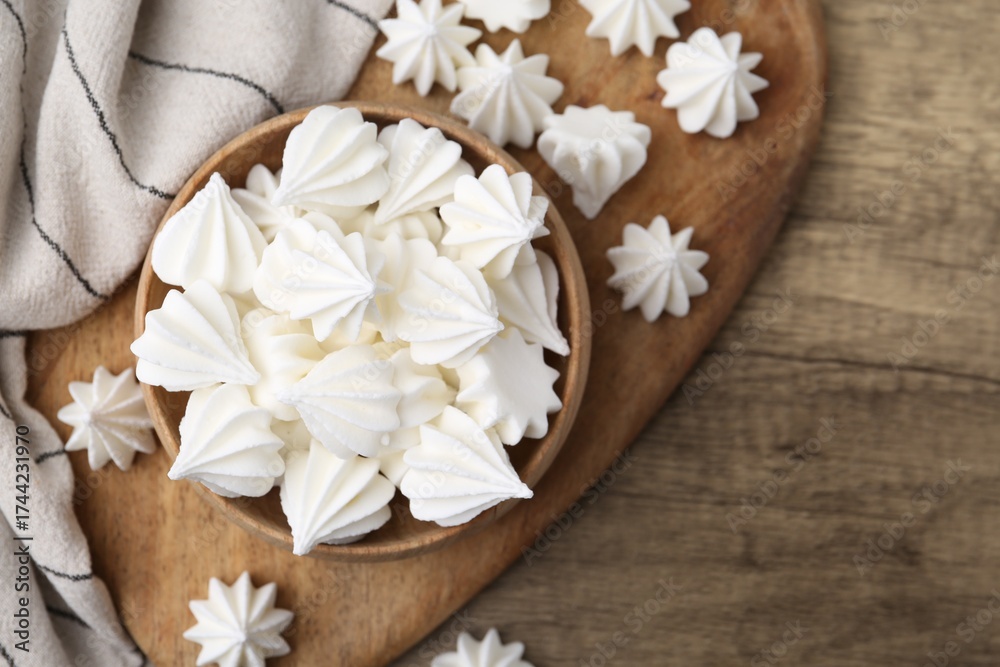 WEBLUX obraz na plátně 1D, 3D, 4D, 5D - Delicious meringue cookies on wooden table, top view. Space for text