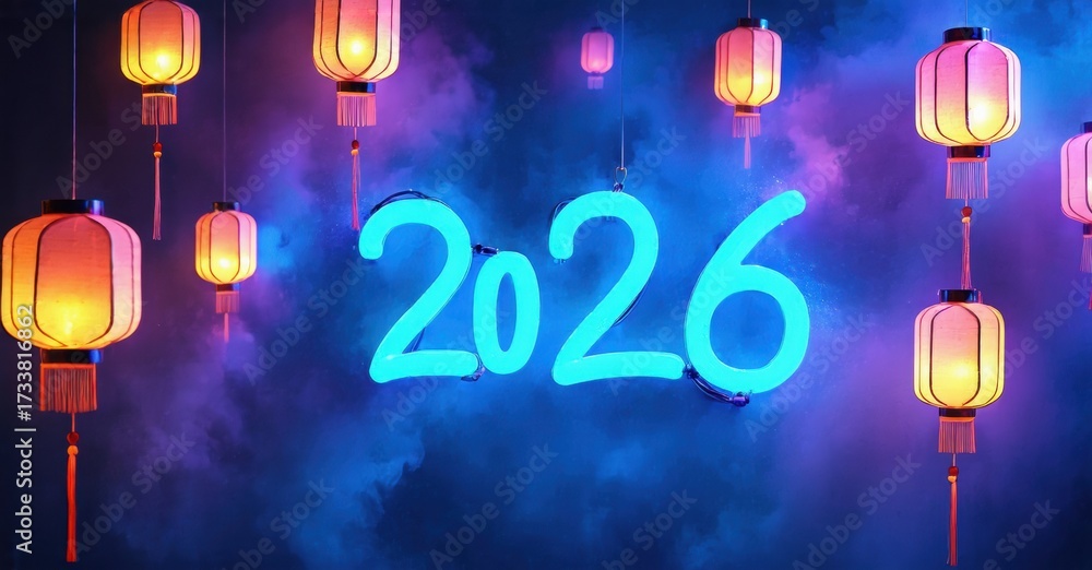 WEBLUX obraz na plátně 1D, 3D, 4D, 5D - Bright neon lights display year 2026. Hanging lanterns illuminate background, creating festive atmosphere. Vivid colors dominate scene.