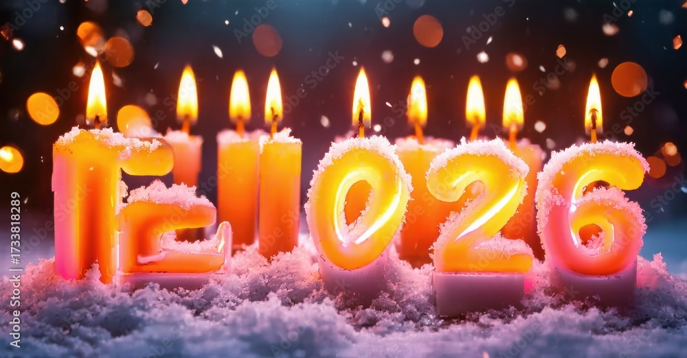 WEBLUX obraz na plátně 1D, 3D, 4D, 5D - Candles forming year 2026. Festive illumination, snow, bokeh effects create celebratory mood. Bright flames glow warmly.