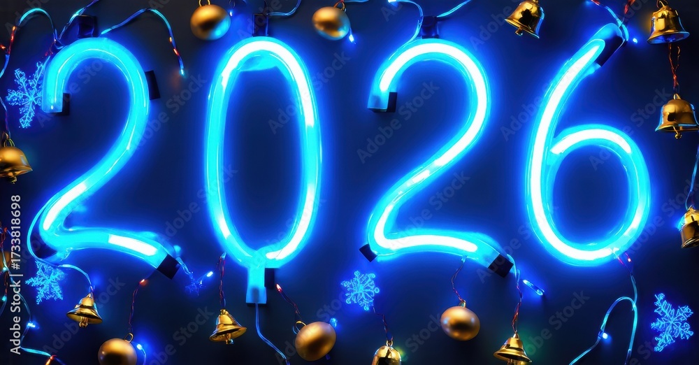 WEBLUX obraz na plátně 1D, 3D, 4D, 5D - Bright neon digits display year 2026. Festive lights, snowflakes, golden bells create celebratory backdrop. Vivid blue dominates scene.