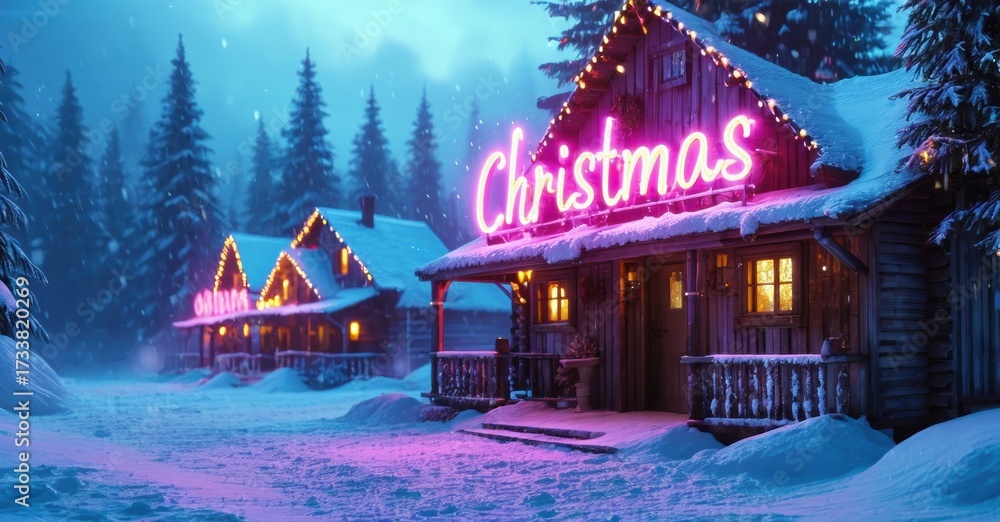 WEBLUX obraz na plátně 1D, 3D, 4D, 5D - Snowy cabins glow with vibrant neon lights. Festive Christmas scene evokes winter warmth, peaceful atmosphere. Beautiful, serene landscape.